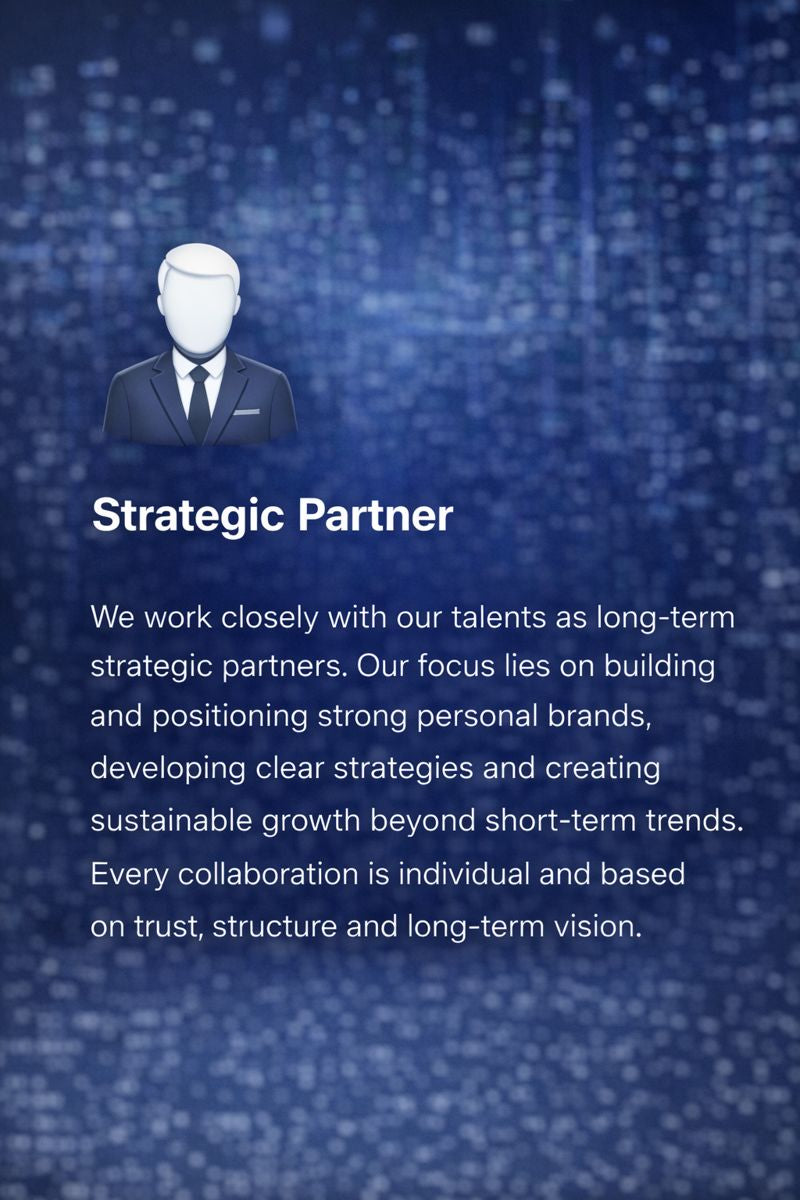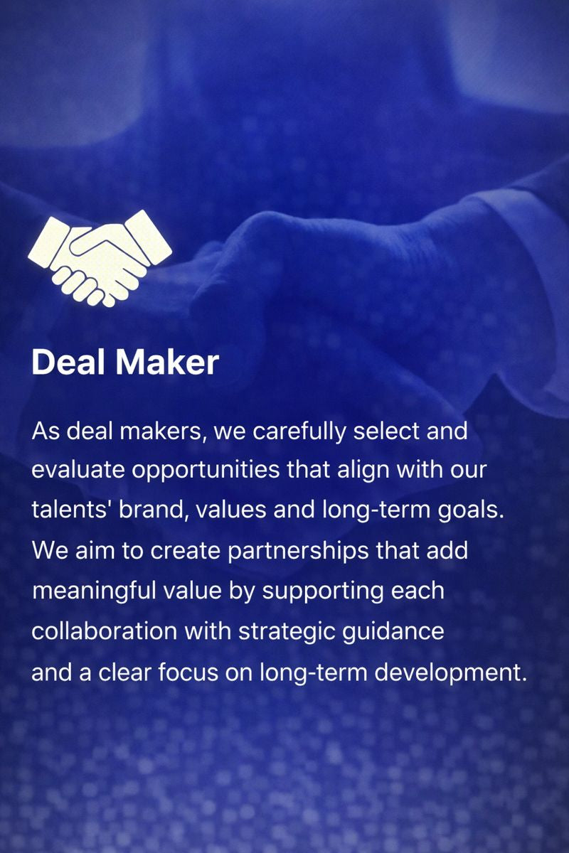 A global talent agency working with celebrities, public personalitites and people of influence to strategically build and develop their personal brand and influence. Alongside long-term positioning and growth, we support the selection and development of meaningful deals and partnerships aligned with each talent’s vision.
